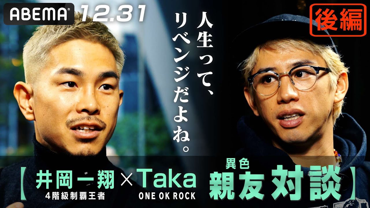 【後編】井岡一翔×ワンオクTaka、異色の親友対談!「人生ってリベンジだよね。」 プロボクシング・WBA世界スーパーフライ級王者の井岡一翔とロックバンドONE OK ROCKのボーカル・Takaが対談を行った。 ◆『SANKYO presents LIFETIME BOXING FIGHTS 25』 ABEMA で国内独占無料生中継‼ 12/31 (火) ごご3時〜視聴はこちら▷https://abe.ma/41IvKAg 井岡選手の試合はよる8:30~ごろ douga1oriconOricon NewsORICON NEWS Channelオリコンオリコンニュース予告編 WACOCA: People, Life, Style.