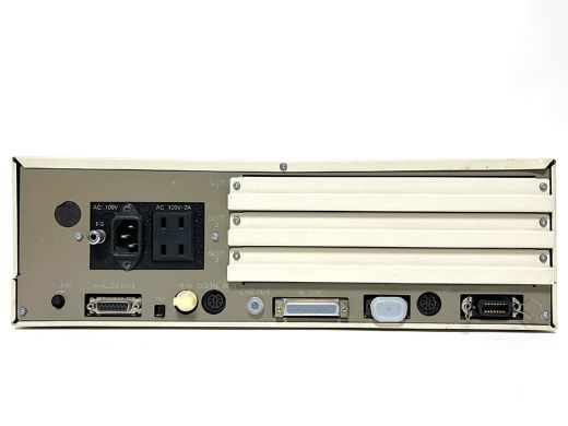本体背面は左から、電源コネクタとサービスコンセント×2、拡張スロット×3となります。下段は左からボリュームつまみ、アナログRGB端子、B/W切り替えスイッチ、モノクロモニタ端子、デジタルRGB端子、ラインアウト端子、RS-232Cコネクタ、ジョイスティックが接続できるI/Oポート、CMT端子、プリンタポートとなっていました。アナログRGBに対応したモニタに接続すれば、512色中8色が表現できます。