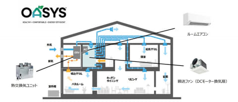 OASYSは、ルームエアコン、熱交換気ユニット、DCモーター換気扇を用いた搬送ファンで構成された米国発の全館空調システム。従来の空調方式に対して50%以上の省エネに貢献できるとする。テキサス州で販売を開始し、エリアは順次拡大予定。
