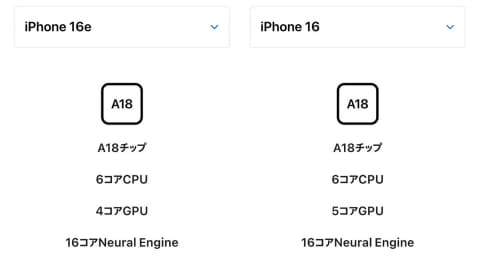 iPhone 16e(左)と、16の「A18」の違い。カタログ上、GPUの個数が異なる。