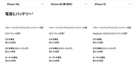 アップルの公開しているバッテリー動作時間。左から16e、SE(第3世代)、16。16eはどれよりも動作時間が長い