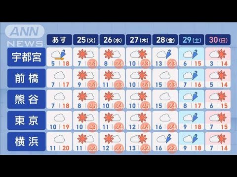 週間予報です。24日は曇りで少し暑さが落ち着きそうです。25日から28日にかけては5月並みの24℃前後の日が続く見込みです。この暖かさでサクラも一気に咲き進むでしょう。