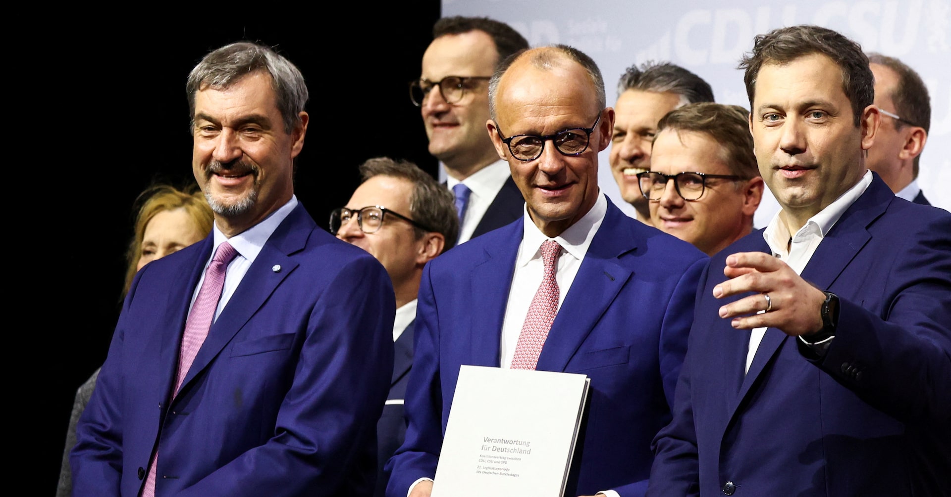 ドイツの保守政党連合キリスト教民主・社会同盟(CDU・CSU)と中道左派政党、社会民主党(SPD)の党首らが5日、連立協定に署名した。(2025年 ロイター/Liesa Johannssen)