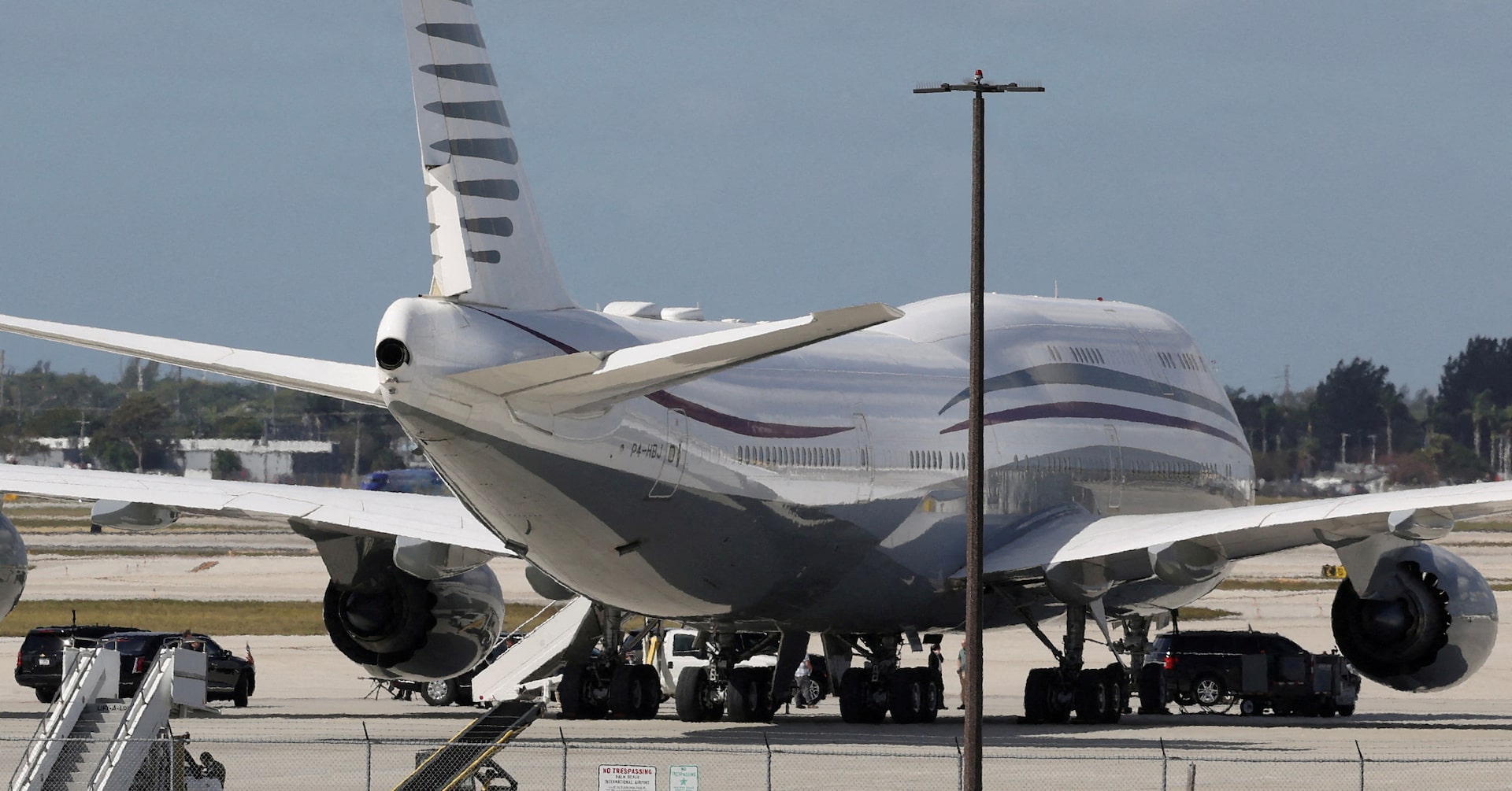 トランプ米大統領がカタール王室から高額の航空機を無償で譲り受ける計画を巡り、野党民主党だけでなく与党共和党議員からも懸念の声が相次いでいる。写真は、カタール所有のボーイング機。2月15日、フロリダ州のパームビーチで撮影(2025年 ロイター/Kevin Lamarque)