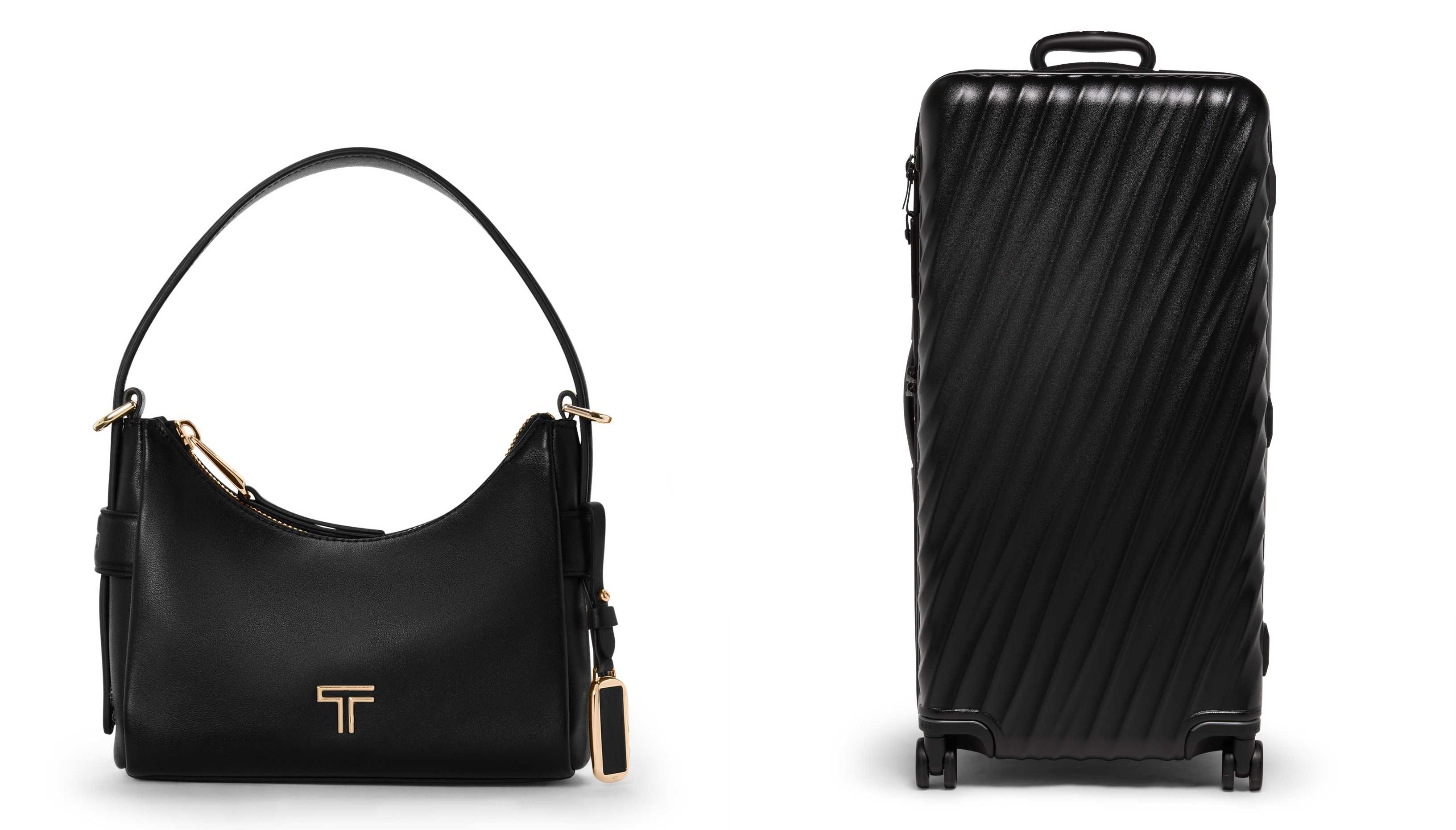 (左から)Voyageur「エヴォラ」ミニ・ホーボー ブラック/ライト ゴールド、19 Degreeローリング・トランク ブラック テクスチュア
