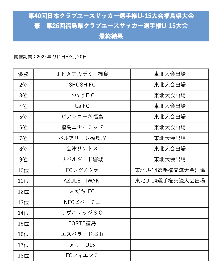1位:パルアリーレ福島JY、2位:ビアンコーネ福島、3位:エスペラード郡山、4位:FCフィエンテ