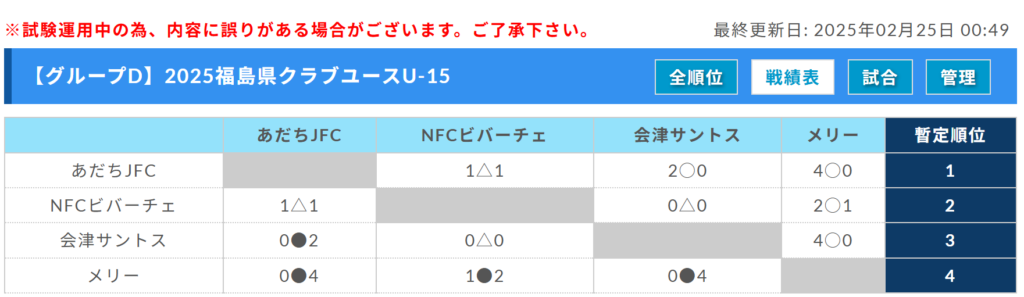 1位:あだちJFC、2位:NFCビバーチェ、3位:会津サントス、4位:メリー