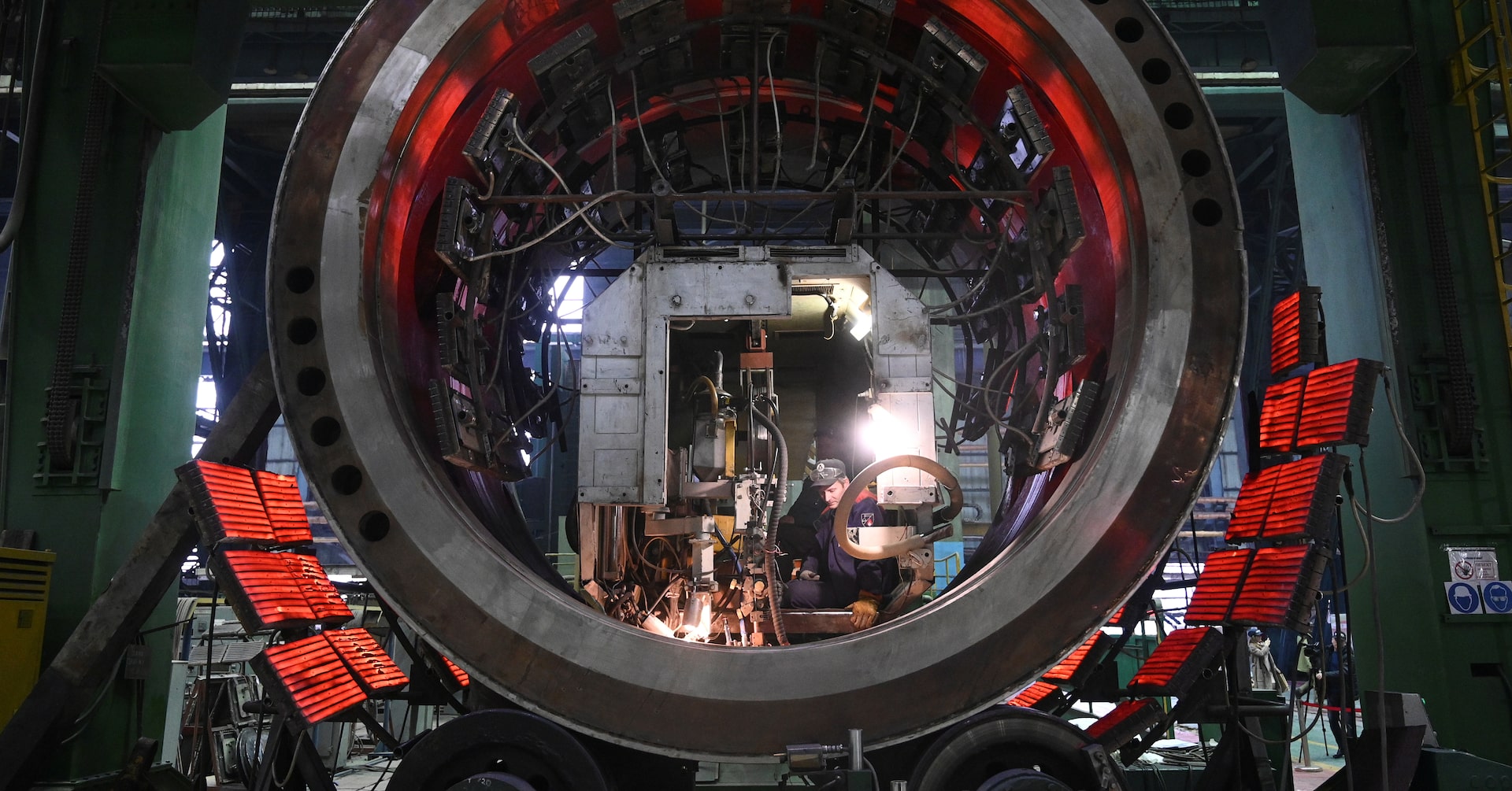S&Pグローバルが2日発表した5月のロシア製造業購買担当者景気指数(PMI)は50.2と前月の49.3から上昇し、3カ月ぶりに拡大と縮小の分かれ目となる50を上回った。写真は原発の設備製造工場で働く労働者。2029年に撮影(2025年 ロイター/Sergey Pivovarov)