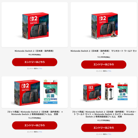 ラインナップは「Nintendo Switch 2(日本語・国内専用)」や「Nintendo Switch 2(日本語・国内専用) マリオカート ワールド セット」のほか、Switch2カメラセットなど全4商品。抽選結果は当選者へ向けて6月20日頃にメールが送付される予定で、商品発送予定日は当選者にのみ告知される。