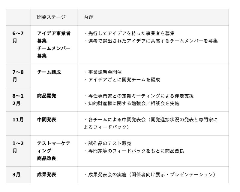 選考によって選ばれた商品アイデアを持った事業者がチームリーダーとなり、アイデアに共感した多様なスキル・専門性を持つ参加者と開発チームを結成し、約8ヶ月間にわたり開発を進めます。