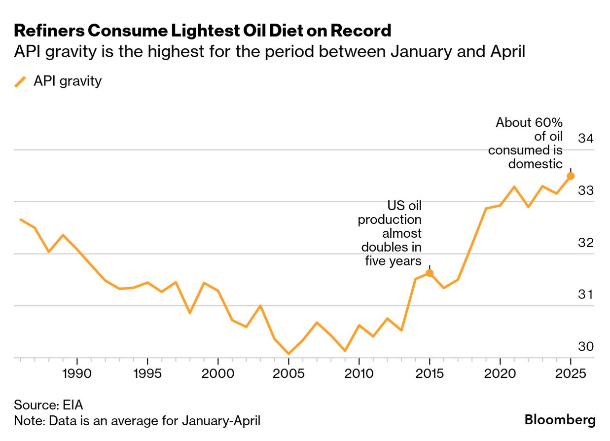 米政府の直近データによれば、米製油業者は現在、テキサス、ニューメキシコ、ノースダコタ各州のシェール油に大きく依存し、軽質油の処理比率が過去最高水準に達している。背景には、メキシコの原油減産やカナダとの貿易摩擦、ベネズエラ原油の事実上の輸入禁止措置などに起因する重質油の供給減がある。