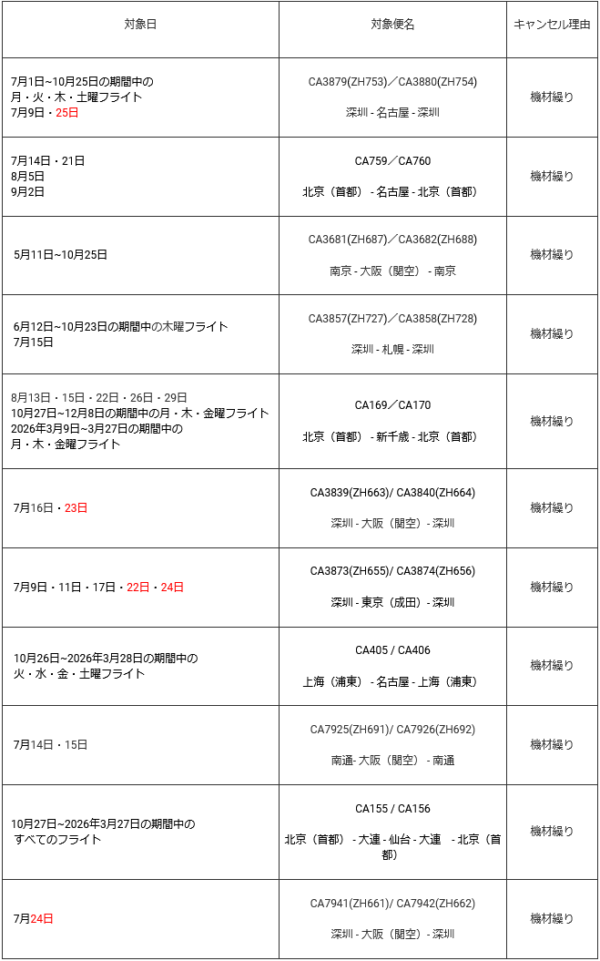 中国国際航空は、傘下の深圳航空の運航便を含めた日本発着路線において、運航計画の変更を発表し、減便または運休路線が発生することを発表しました。