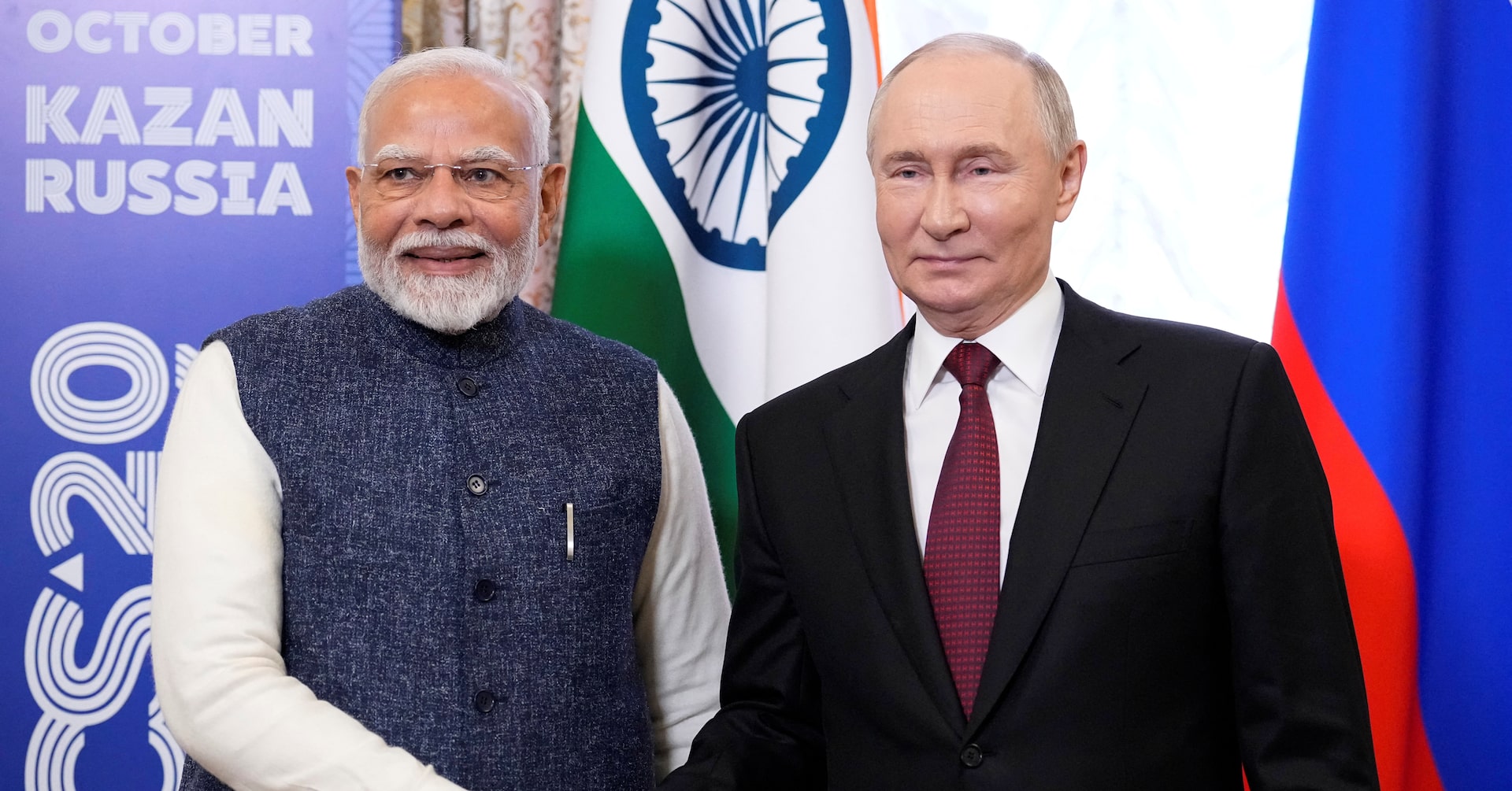 トランプ米大統領は5日、インドがロシア産原油の輸入を続けていることを踏まえ、インドに課す関税率を24時間以内に現行の25%から「大幅に」引き上げると述べた。写真はインドのモディ首相とロシアのプーチン大統領。2024年10月、ロシア・カザンで撮影(2025年 ロイター/Alexander Zemlianichenko/Pool via REUTERS)