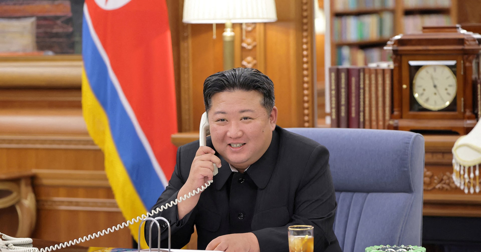 ロシア下院は14日、ウォロジン下院議長が北朝鮮の首都・平壌を公式訪問し、金正恩朝鮮労働党総書記と会談したと発表した。プーチン大統領と電話会談を行う金総書記。平壌で13日撮影の提供写真(2025年 ロイター/KCNA via REUTERS)