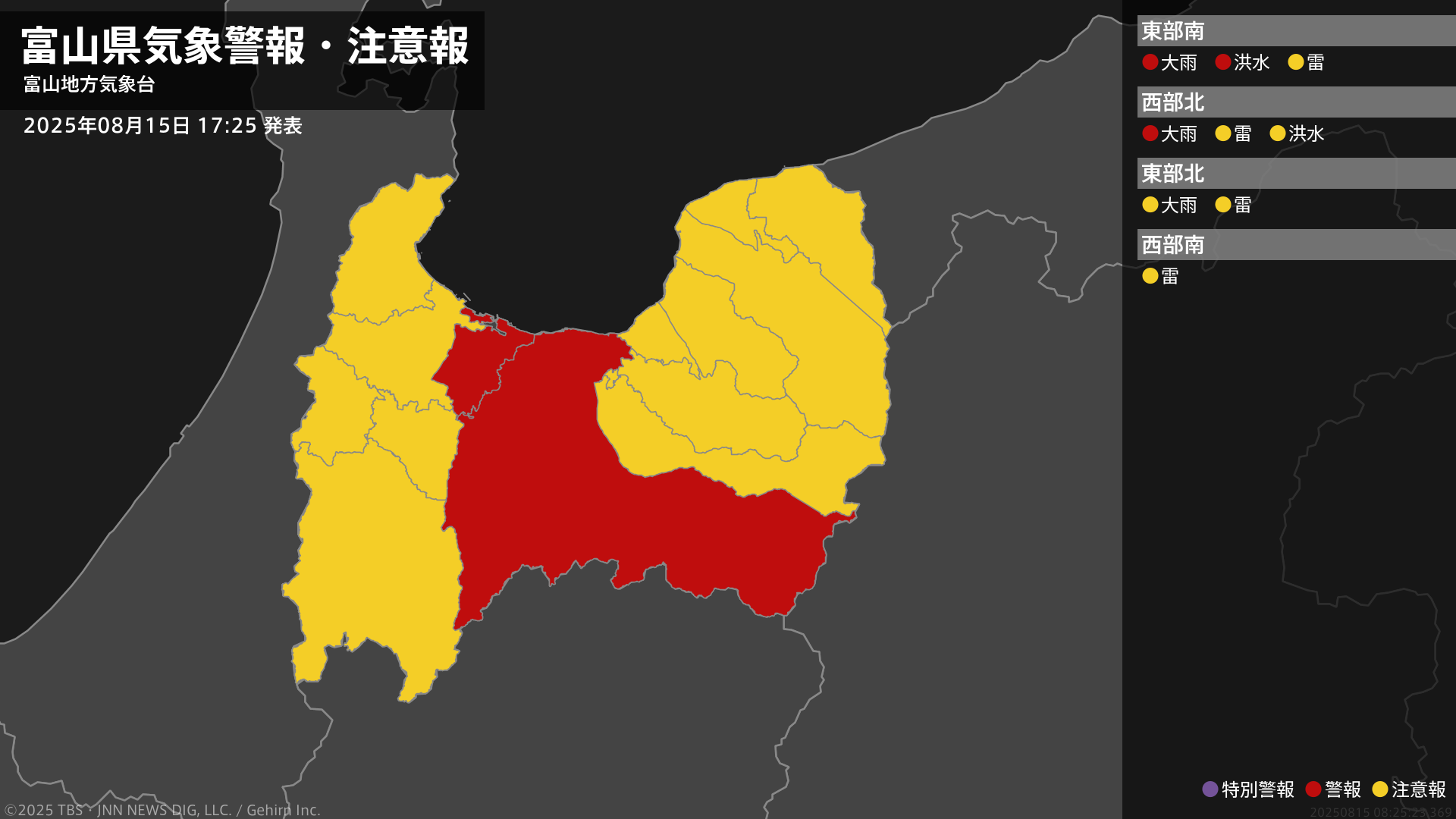 【大雨警報】富山県・射水市に発表 15日17:25時点