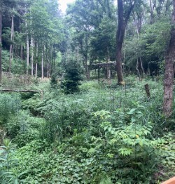 (2025年7月に降った大雨の影響で、森の出口付近の川に土砂が流れ水の流れる道が埋まってしまいました)