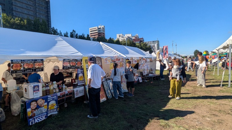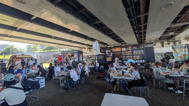 幌平橋の下の飲食コーナー。手ぶらバーベキューがうれしいです。キッチンカーが11台出店していました。日陰は一息つけます。