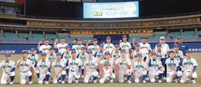 26日に名古屋市東区のバンテリンドームナゴヤであった「第13回中日ドラゴンズカップ2025中学硬式野球大会」の決勝戦。石川ボーイズは、持ち味の打撃力で福井中央リトルシニアを4−2で破り、優勝した。(甲斐崎颯斗)
