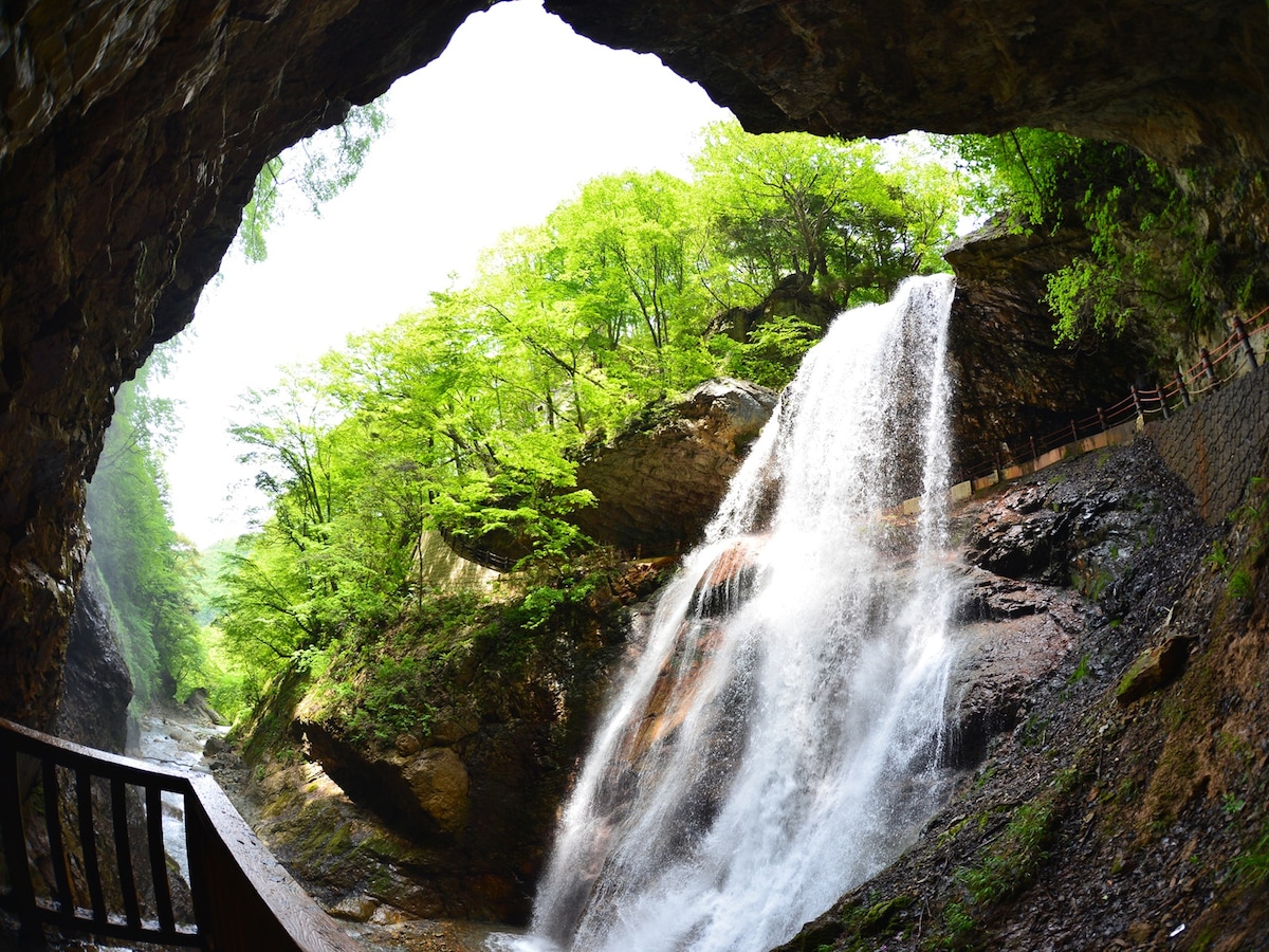 その名に違わぬ迫力で音を轟かせる「雷滝」は、落差30mを一気に流れ落ちる豪快な水流が魅力の滝。最大の特徴は、滝の裏側に回り込んで眺めることができる“裏見の滝”という構造です。頭上から水が降り注ぐような感覚と全身に伝わる轟音が、ほかでは味わえない非日常感を演出します。水しぶきと風が吹き抜ける滝裏の空間は真夏でもひんやりと心地よく、自然の中で五感を開放できる貴重な場所。滝そのものの力強さを間近で感じたい人にはたまらない体験です。