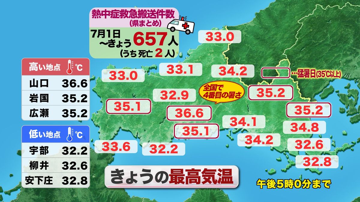 日中の最高気温は35度を超えたところも多く、特に山口市は36.6度と、全国で4番目の暑さとなりました。