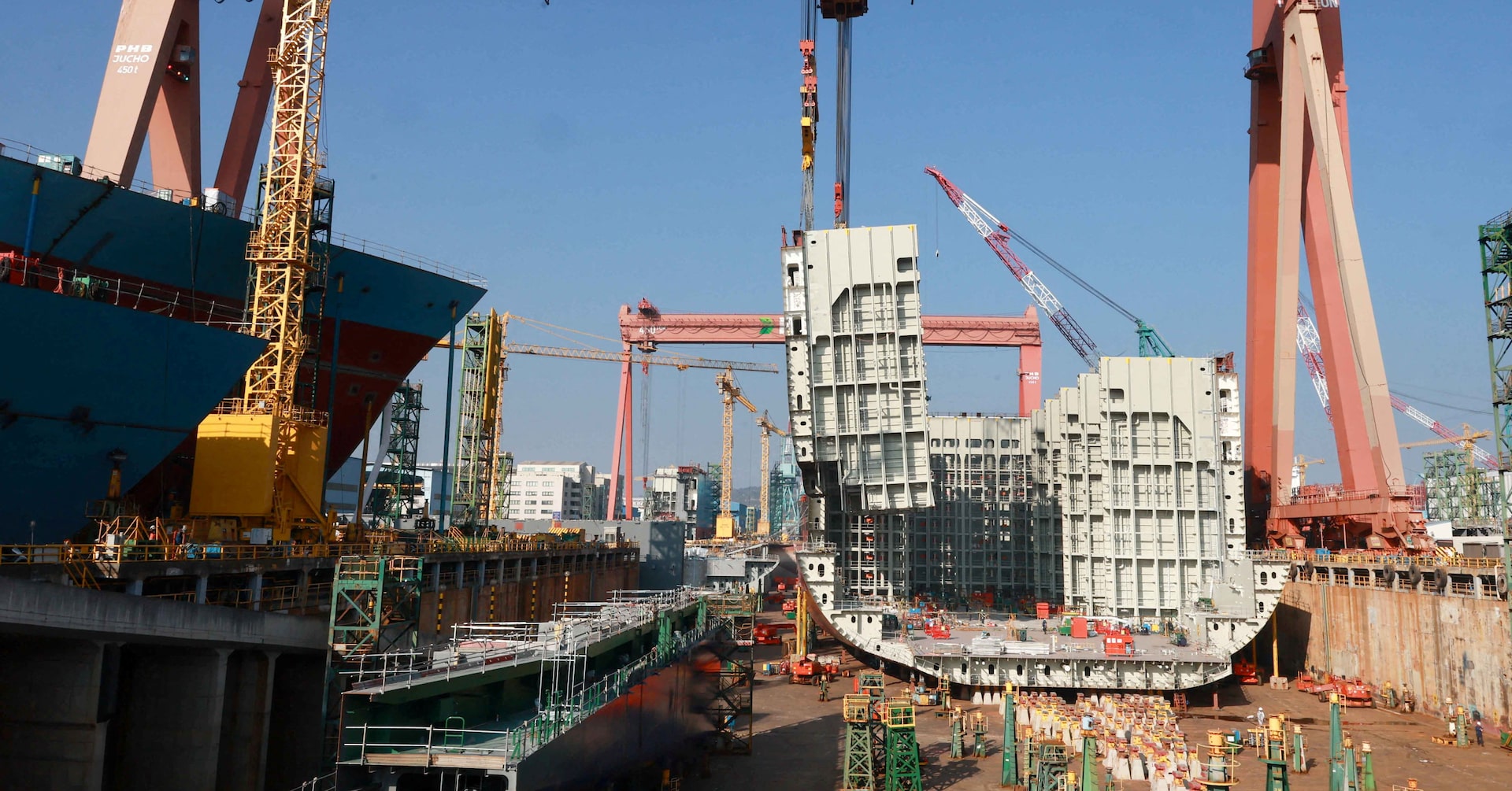 米国を訪れている韓国の李在明大統領は26日に韓国のハンファグループが所有する造船所を訪れ、対米投資計画を強調する予定だ。写真は韓国の造船所。2023年12月撮影。HD現代重工業提供(2025年 ロイター)