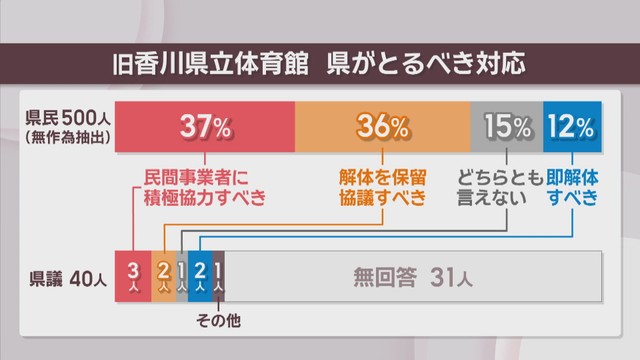 再生委員会が調査会社に委託して行ったアンケートでは、香川県民500人のうち「県は民間事業者に積極的に協力すべき」「解体手続きを保留し協議に応じるべき」と答えたのはあわせて7割を超えていました。