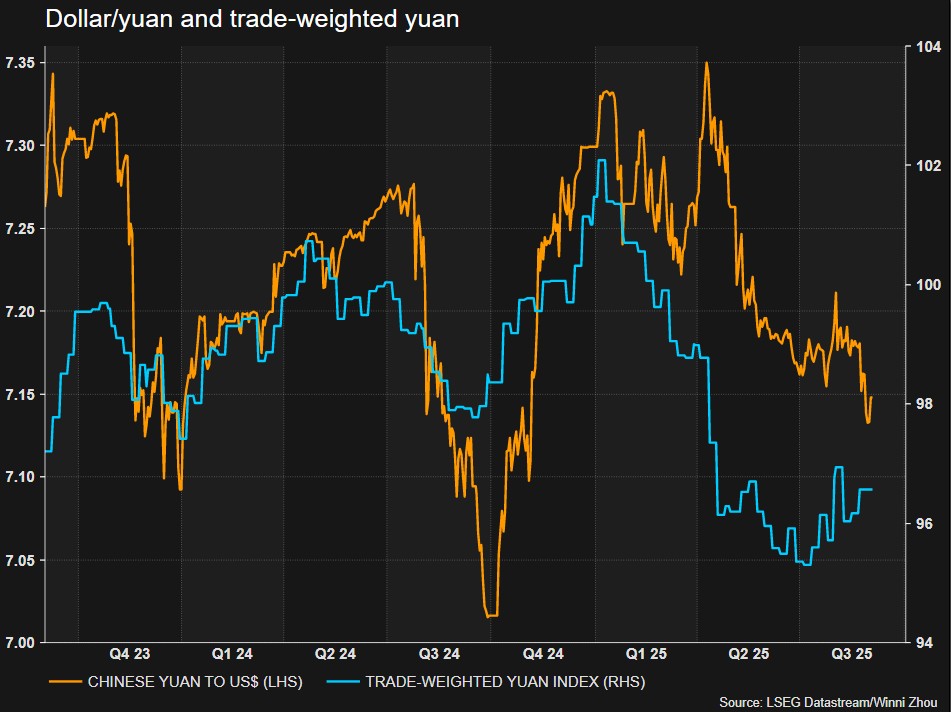 9月3日、注目すべき今年の傾向のひとつに、トランプ米大統領の長年にわたる経済的常識を覆そうとする取り組みに対して市場が直感に反するような反応を頻繁に示すことが挙げられる。写真は人民元紙幣。2022年4月撮影(2025年 ロイター/Florence Lo)