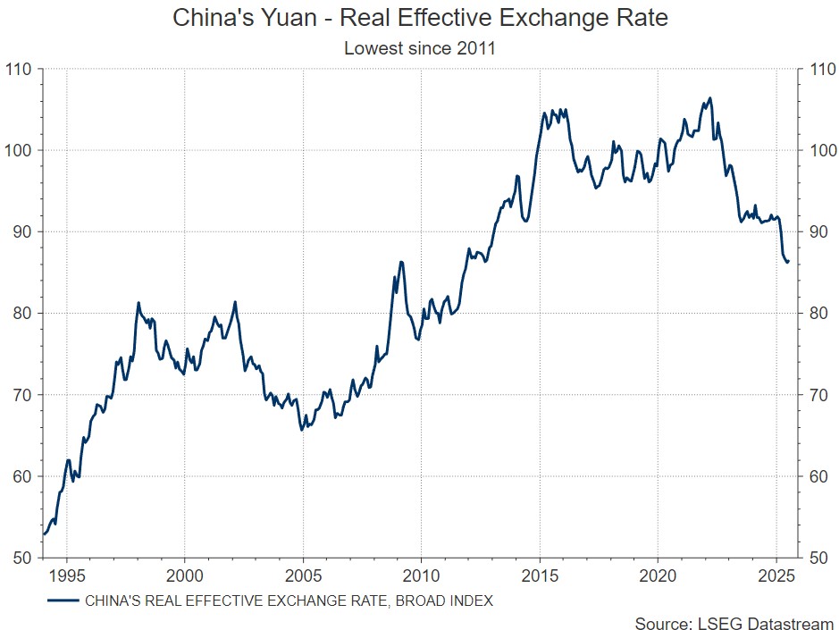 人民元はトランプ氏による4月2日の「相互関税」発表に伴う混乱の中で1ドル=7.350元付近と18年ぶりの安値を付けた。そして近年の低インフレやデフレと相まって、人民元の実質実効為替レートは10年以上ぶりの低水準となっている。