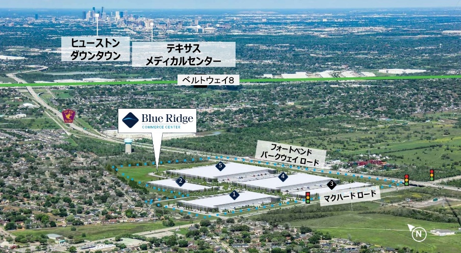 このたび竣工したマルチテナント型物流施設「ブルーリッジコマースセンター」は、テキサス州ヒューストンの南西部に位置し、世界最大規模の医療研究施設である「Texas Medical Center(テキサスメディカルセンター)」から約20km、ヒューストン中心部から約34kmに立地しています。また、ヒューストン内の主要産業道路である環状道路「Beltway 8(ベルトウェイエイト)」に近接することに加え、空路、陸路、海路のいずれの拠点にもアクセスが良い場所に位置。商業および住宅地、周辺市街地への接続にも優れている立地を活かし、ヘルスケアやエネルギーなど多様な産業に対応可能な物流施設です。