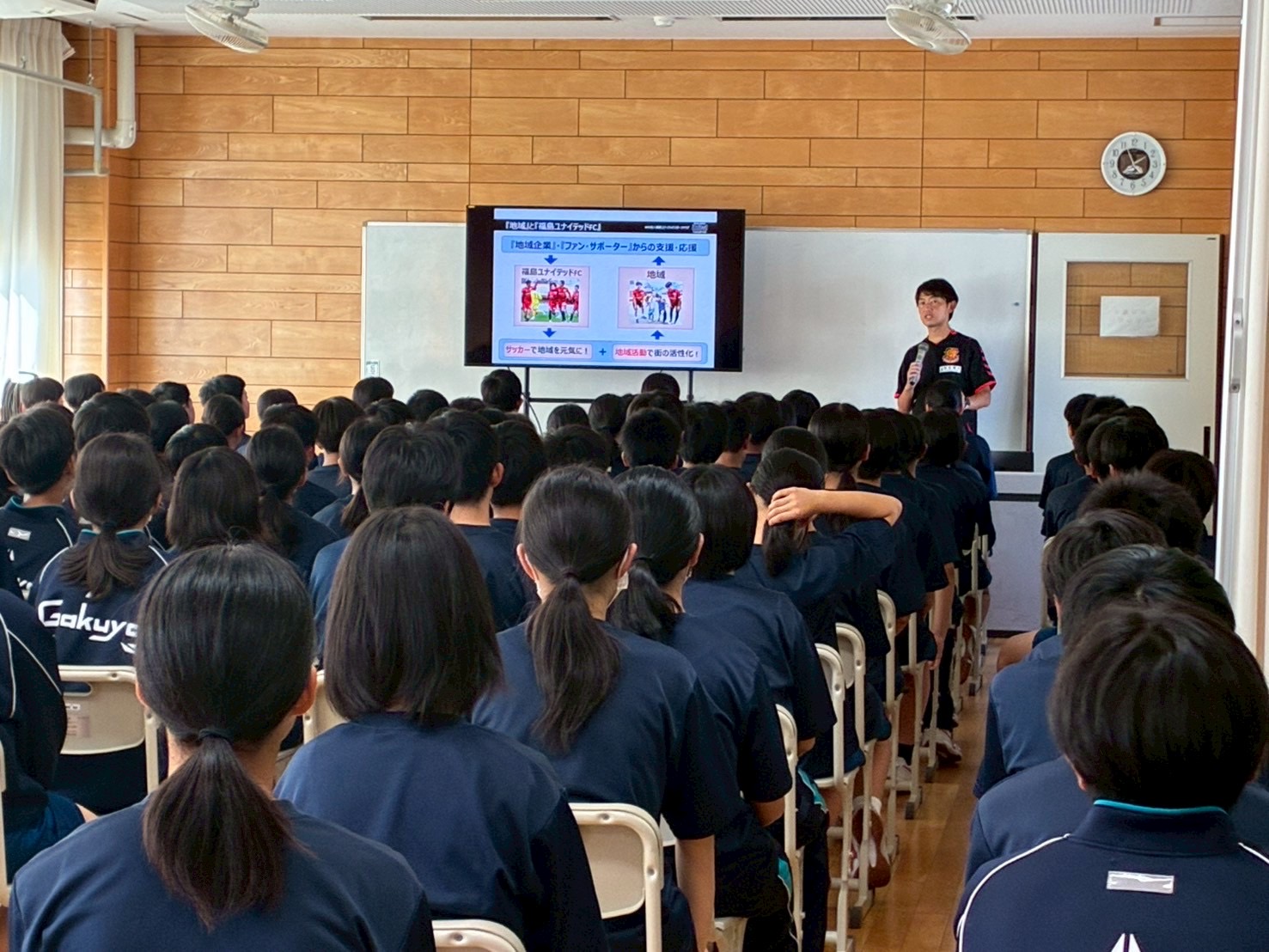 当日は清野通仁(普及・育成マネージャー)とTOPチームから上畑佑平士選手が福島市立岳陽中学校の第1学年115名に講演を行いました。