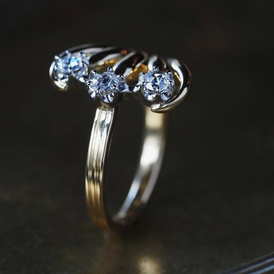プラチナの台座にダイヤモンドを3石配し、アーム部分にはゴールドを用いたコンビネーション仕様。異なる地金を組み合わせることで、クラシカルな存在感がいっそう際立ちます。