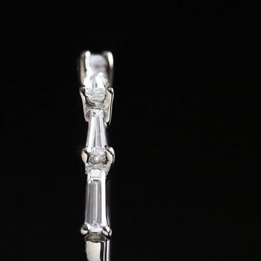 まだ正式な名称が決まっていないほど、工房から仕立て上がったばかりの最新作です。テーパーダイヤモンドを連ね、直線と角度から生まれる構造美を極限まで研ぎ澄ましました。