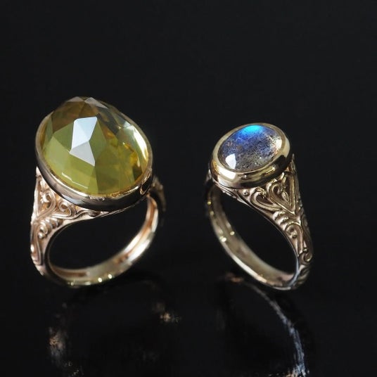 瑞々しい艶を放つカボションカットを、ペアシェイプやオーバル、ラウンドなど多彩な形で楽しめる「サンクルール」。一本のリングに色とフォルムが響き合うデザインです。鋭く成型した爪が高さのある石をしっかり支え、丸みのある愛らしい表情を引き立てます。一本で着けても、従来のサンクルールと重ねてカットの違いを楽しんでも。オーダーではご家族や大切な方の誕生石を選び、ファミリーリングとしてのお仕立ても承ります。