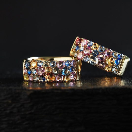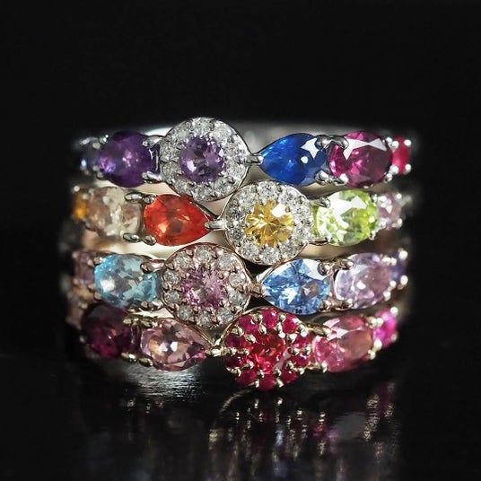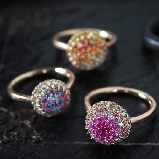 オレンジ、イエロー、ピンク、ブルーと彩り豊かな大粒のカラーストーンを、ダイヤモンドをあしらった繊細なアームに爪留めしました。1点ごとに表情が異なり、指先に確かな存在感を添えてくれます。