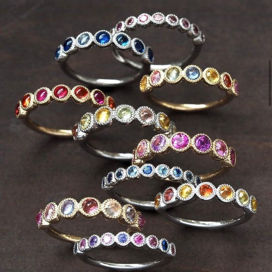 アンティークの技法「ミル留め」で仕立てた「ミルシェノン」シリーズ。繊細なミルの珠が石を縁取り、あたたかな輝きを放ちます。オーバルやラウンド、V字やストレートなど多彩なデザインに加え、刻み模様や矢羽根模様のアームも魅力。重ね着けにもなじみやすく、色とりどりのカラーストーンからお気に入りの一本を選んでいただけます。