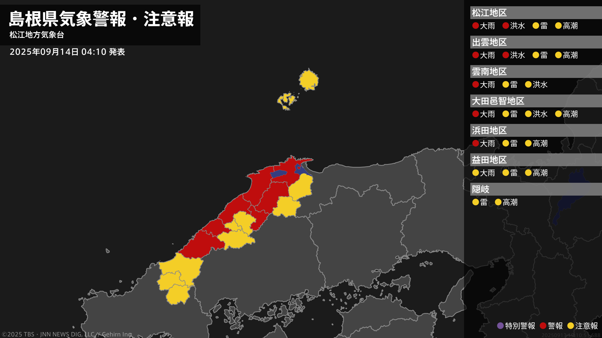 【大雨警報】島根県・浜田市に発表 14日04:10時点