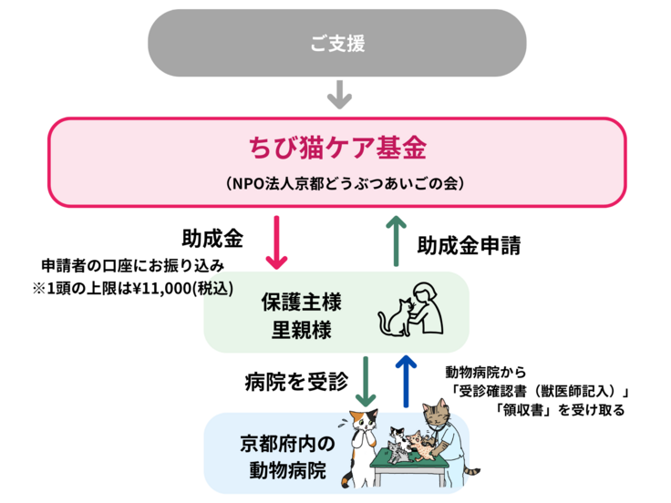その想いから、京都府全域の動物病院で受診いただいた際の「子猫の初期医療費」を助成する「ちび猫ケア基金」へと進化させます。*2