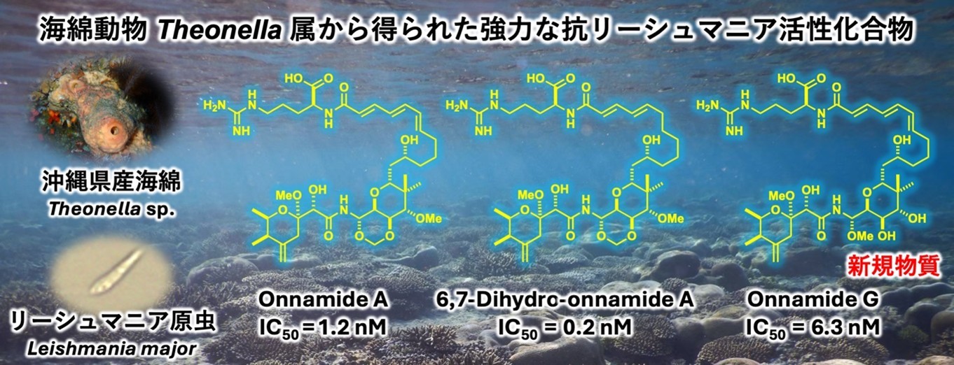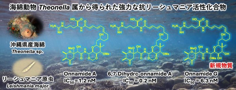 安元加奈未(東京理科大学薬学部)、城森啓宏(琉球大学理学部)、林康広(宮崎大学農学部)、廣瀬美奈(一般社団法人トロピカルテクノプラス)、田中淳一(琉球大学名誉教授)らの研究グループは、沖縄産の海綿動物Theonella sp.から、新規化合物「オンナミドG(onnamide G)」を含む10種の天然化合物を単離し、それらが寄生虫リーシュマニア原虫に対して極めて高い駆除活性を示すことを明らかにしました。