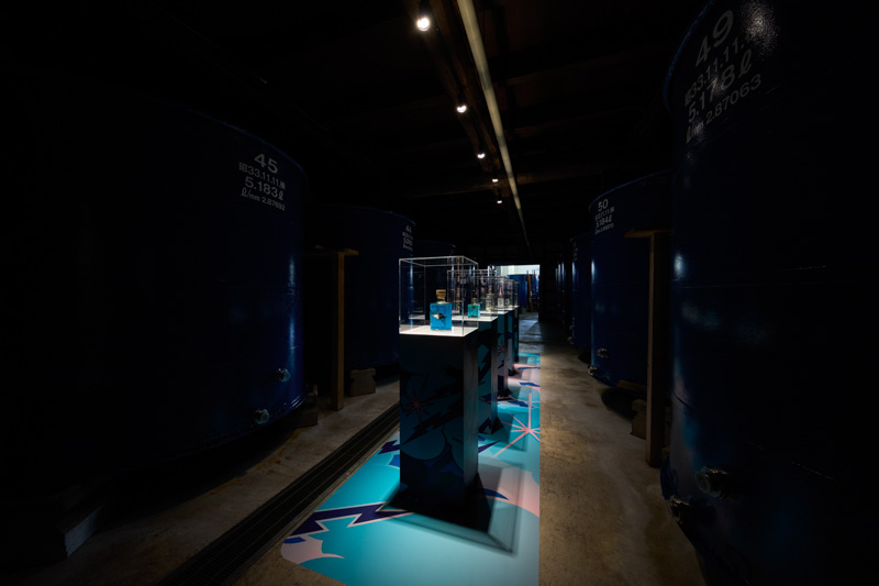 1階には、舘鼻則孝 x 桝田酒造店のコラボレーションによる《舘⿐則孝×桝⽥酒造店 Masuizumi Bottle Art》が展示されており、ショーケースの中にはコラボデザインの現代アートを施した酒瓶が並びます。