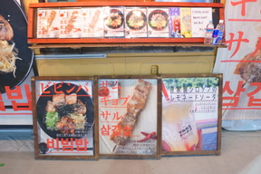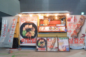串焼きのサムギョプサル、厚切り豚タン塩、牛ハラミ(各800円)やビビンバ(各1200円)を販売している。
