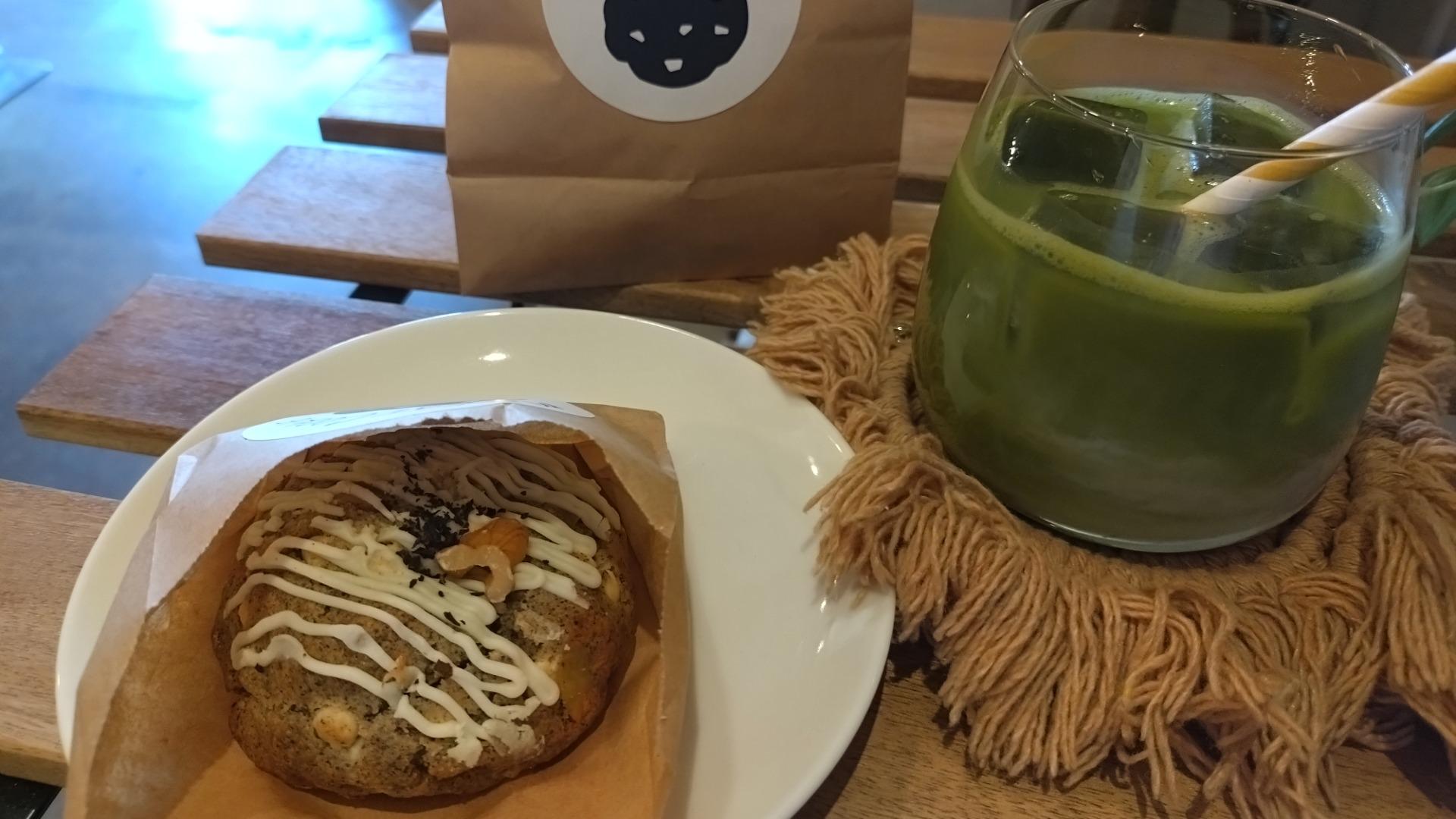 日本のクッキーはサクサクとした食感が多いですが、こちらのお店のアメリカンクッキーはしっとりザクザクの食感で、まさにおやつにぴったりです。クッキー1枚で満足感を得られます。抹茶ラテと合わせていただきました。抹茶ラテの苦味とクッキーの甘さがマッチしていて、プチぜいたくな気分を味わえました。
