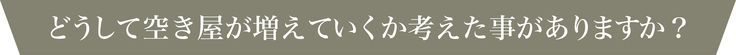 生活環境や身体状況の変化、バリアフリーの問題などで親が高齢になり、実家を離れ施設に入所する方が多くなっています。住まなくなった実家を壊す事も出来ず、相続の話も出来ないまま放置され続ける空き家。新築需要が増える経済状況からもどうする事も出来ず放置されている問題です。