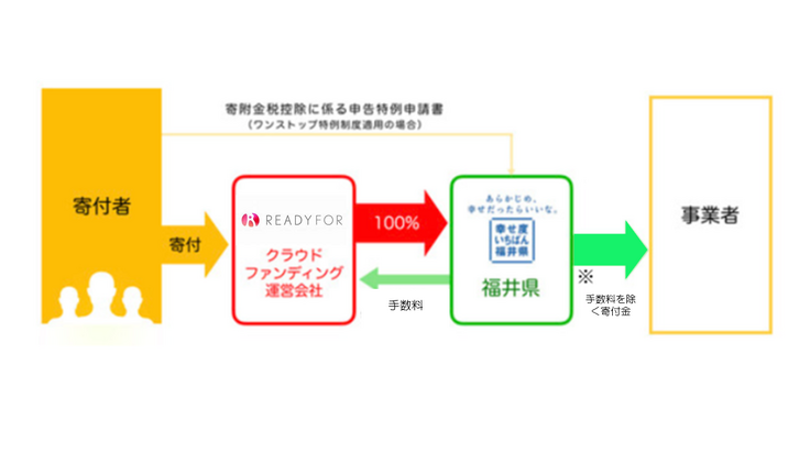 本プロジェクトは、福井県の「ふるさと納税による新事業創出支援事業」の対象事業として認定されています。 寄附金は福井県がふるさと納税として領収し、その寄附金から手数料を除いた額を、奨励金として事業者に支給します。