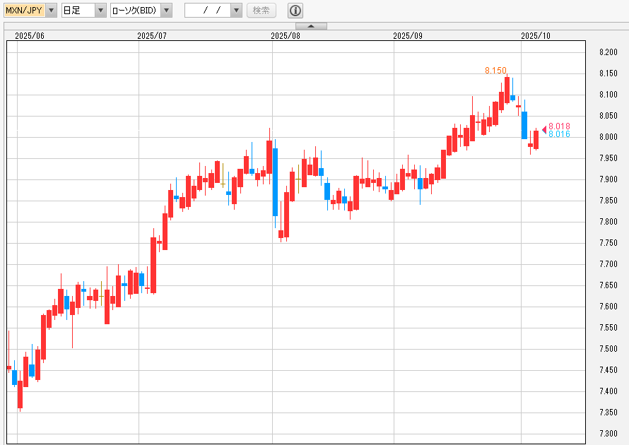 ペソ円は9月に8.15円付近まで上昇し24年8月以来の高値に上昇した。