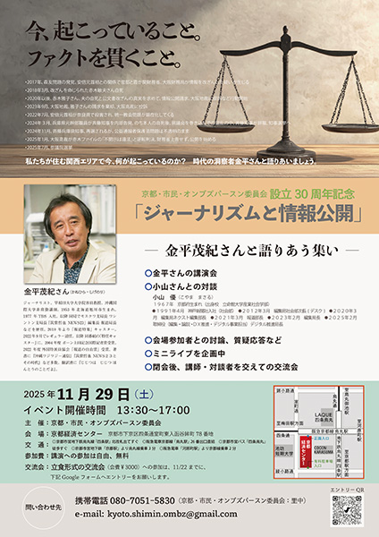 ジャーナリスト金平氏の講演と、元神戸新聞編集局長の小山氏との対談を合わせ、この1~2年の間、特に関西エリア、選挙報道を巡って起こっている、ジャーナリズムと民主主義の危機について、参加者の皆さんと語りあいます。「京都・市民・オンブズパーソン委員会」設立30周年記念のイベント。閉会後、登壇者との懇親会あり。