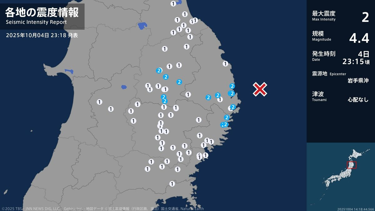 岩手県で最大震度2の地震 岩手県・宮古市、山田町、釜石市、大槌町、盛岡市、八幡平市、紫波町、矢巾町 | TBS NEWS DIG TBS NEWS DIG【地震】岩手県内で震度1 岩手県沖を震源とする最大震度1の地震が発生 津波の心配なし(岩手めんこいテレビ) Yahoo!ニュース震度=気象庁発表(4日23時18分) :地震 oita-press.co.jp【地震】青森県内で震度1 岩手県沖を震源とする最大震度2の地震が発生 津波の心配なし dメニューニュース【地震】岩手県内で震度2 福島県沖を震源とする最大震度4の地震が発生 津波の心配なし FNNプライムオンライン