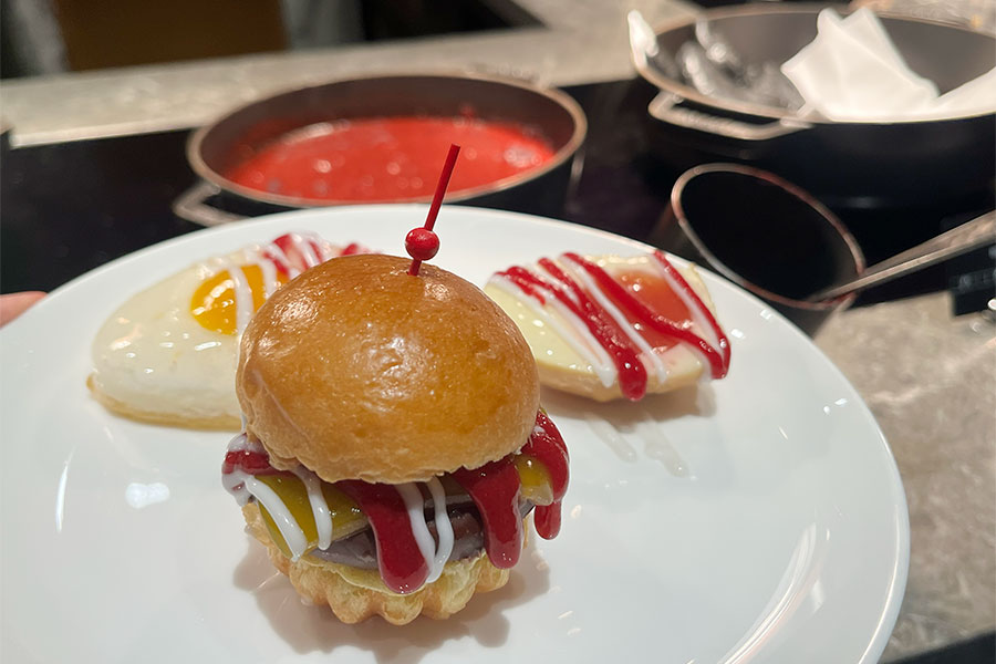 そして、最大の欺きポイントとして注目したいのが、シェフが目の前で仕上げてくれる「ライブクッキング」コーナー。セイボリーに見えるハンバーガーや目玉焼きの正体は、ユニーク過ぎるスイーツなので、パテや黄身、ケチャップやマスタードはどんな味わいなのか、想像を膨らませながら楽しみたい。