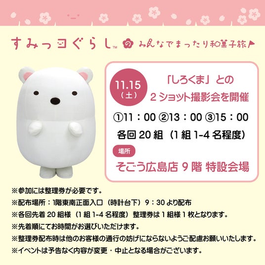 ※開店して整理券が残っている場合は、〈すみっコぐらしのみんなでまったり和菓子旅 in 広島〉会場にて配布いたします。