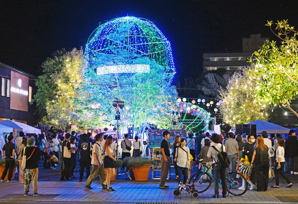 カウントダウン後にスイッチが押されると、街路樹の電飾が一斉に輝いた。佐賀市中央大通りで1日夜に開かれた「サガ・ライトファンタジー」の点灯式。2005年10月1日の市町村合併から20年を迎える記念行事として、例年より約1カ月早く実施した。「皆さんの希望の未来を照らす道しるべになることを祈念している」。坂井英隆市長は満面の笑みを見せた。