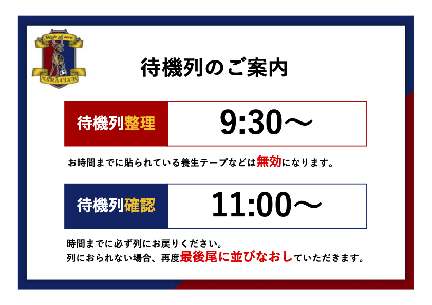待機列整理・待機列確認時間について、開場時間変更に伴い下記に変更いたします。